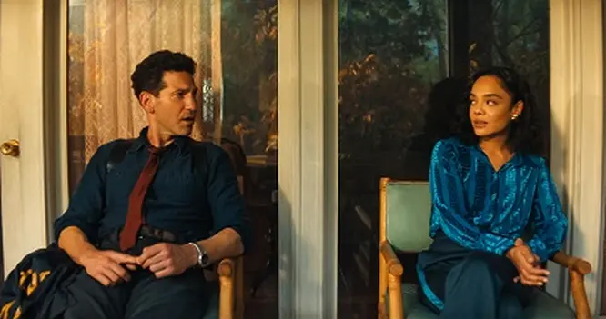 His & Hers. (L to R) Jon Bernthal as Detective Jack Harper and Tessa Thompson as Anna in Episode #101 of His & Hers. Cr. Courtesy of Netflix © 2025