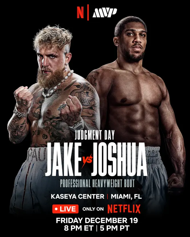 Most Valuable Promotions (MVP) and Netflix today announced Jake vs. Joshua: Judgment Day, a colossal global showdown between boxing’s biggest disruptor, international superstar and WBA #14-ranked cruiserweight Jake “El Gallo de Dorado” Paul (12-1, 7 KOs) and two-time unified WBO, WBA, and IBF heavyweight world champion, Olympic gold medalist and knockout machine Anthony “AJ” Joshua (28-4, 25 KOs). Jake vs. Joshua: Judgment Day will be a sanctioned, professional heavyweight bout contested over 8, three-minute rounds with 10oz gloves. The fight is set to take place on Friday, December 19, at the Kaseya Center in Miami, Florida, and will stream live globally, only on Netflix at no additional cost to its 300+ million members.